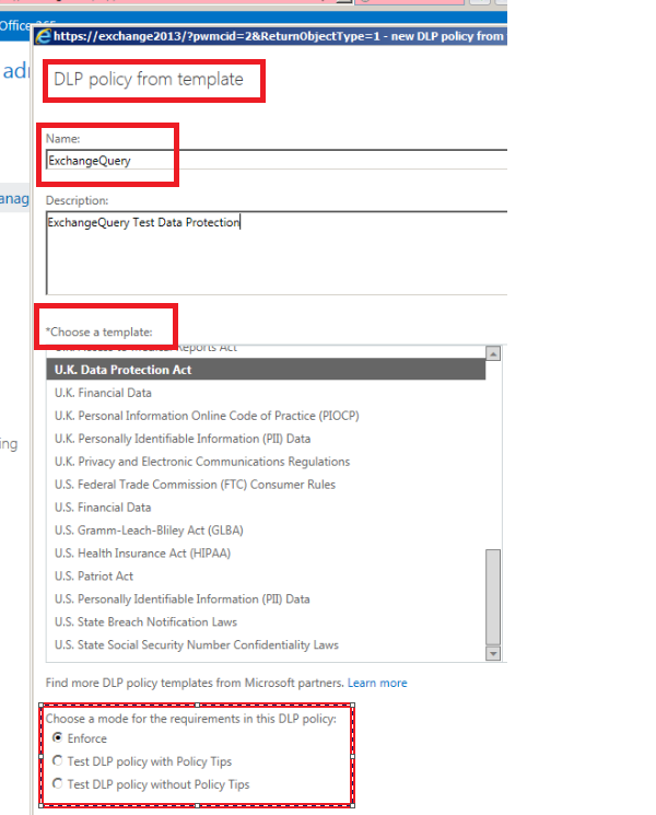 The next screen brings you the DLP policy template where you define name,description,choose template and mode of requirements as below
