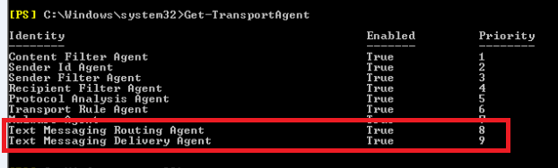 Enable-TransportAgent -Identity “Text Messaging Routing Agent”