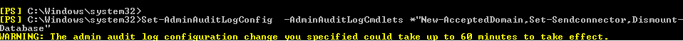 Set-AdminAuditLogConfig -AdminAuditLogCmdlets *”New-AcceptedDomain,Set-Sendconnector,Dismount-Database”