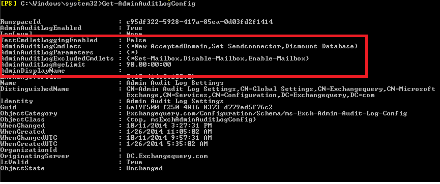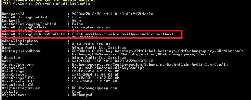 As we can see the AdminAuditlogCmdlets has value * which means it will log all the entries of commandlets except search and Get .Also we can see the excludedcmdlets value is set to null so there is no exclusions set by default.