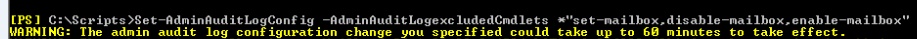Set-AdminAuditLogConfig -AdminAuditLogexcludedCmdlets *”Set-Mailbox,Disable-Mailbox,Enable-Mailbox”