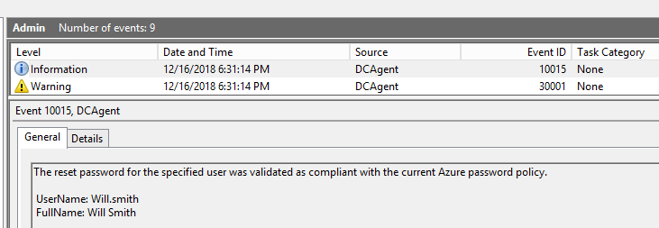 When the same password is provided to end user and when the end user resets them with non-compliant values then those entries also will be logged in the event viewer.