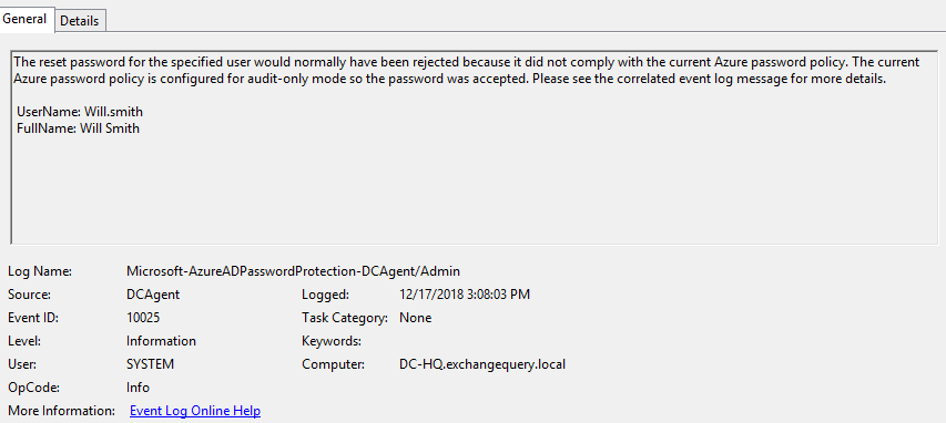 Once enforced in audit mode we get the below confirmation message in Azure Password protection DC Agent Event logs.