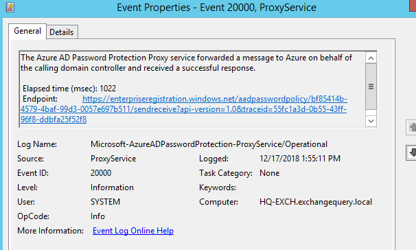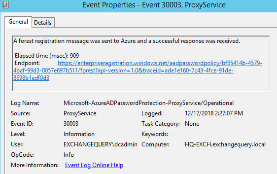 On a successful registration we will be getting the below event log on the Azure AD password protection Proxy Server.