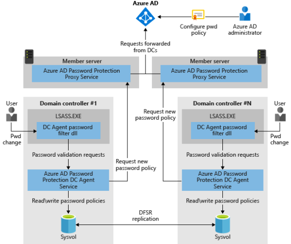 Azure AD password protection DC agent- Receives the password validation request from the filter agent and processes them with the currently present local password policy and returns the validation response Pass/Fail. This core services queries the Azure AD password protection proxy service to check and download the new versions of password policy.