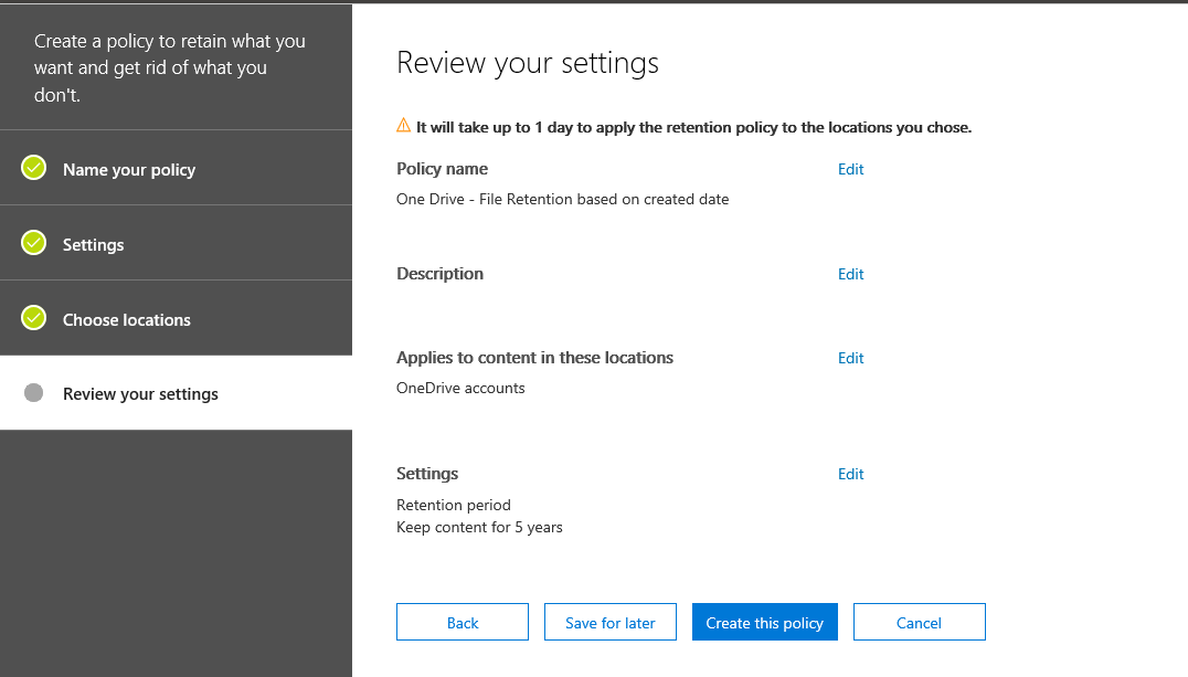 To alleviate the above demeanor we can configure a new retention policy from the security and compliance center only for one drive for business files. As of now we have option to create retention policy based on newly created files and last modified date and time.
