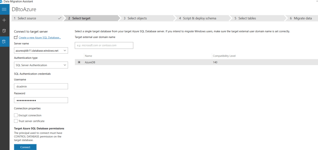 Now we need to specify the target Azure SQL PAAS Db details and the credentials.