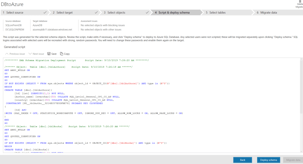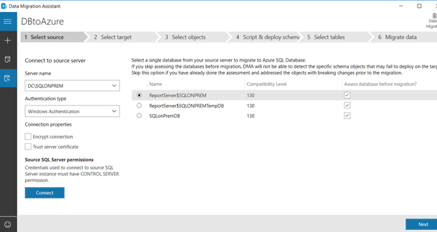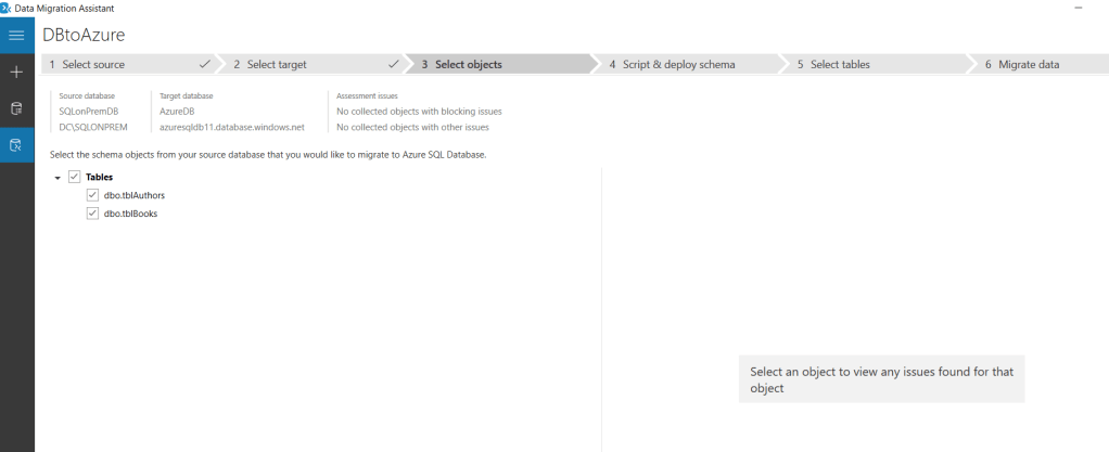 Once after its been authenticated successfully , we can see the schema objects from the source database which we would like to migrate to Azure SQL database.
