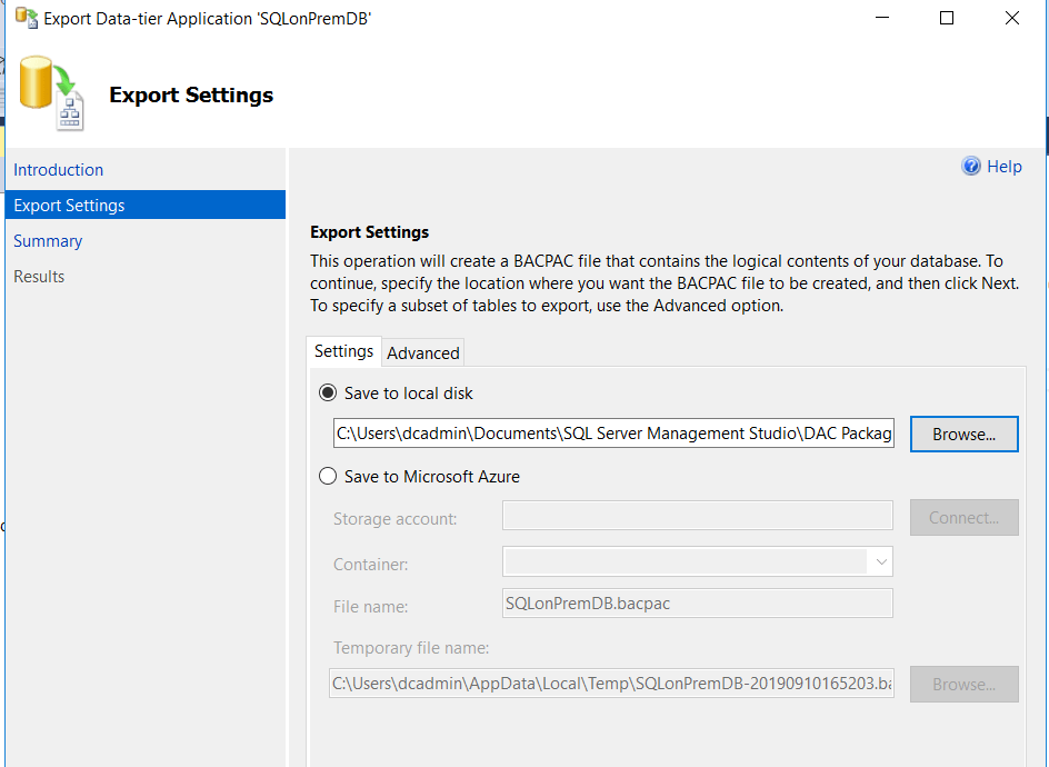 With BACPAC export and import firstly we need to export the SQL database from the on premise SQL instance as a data tier application.