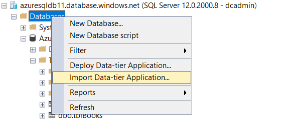 To export – Open SQL Management Studio – Right Click on the desired database and click on tasks – select export data tier application.