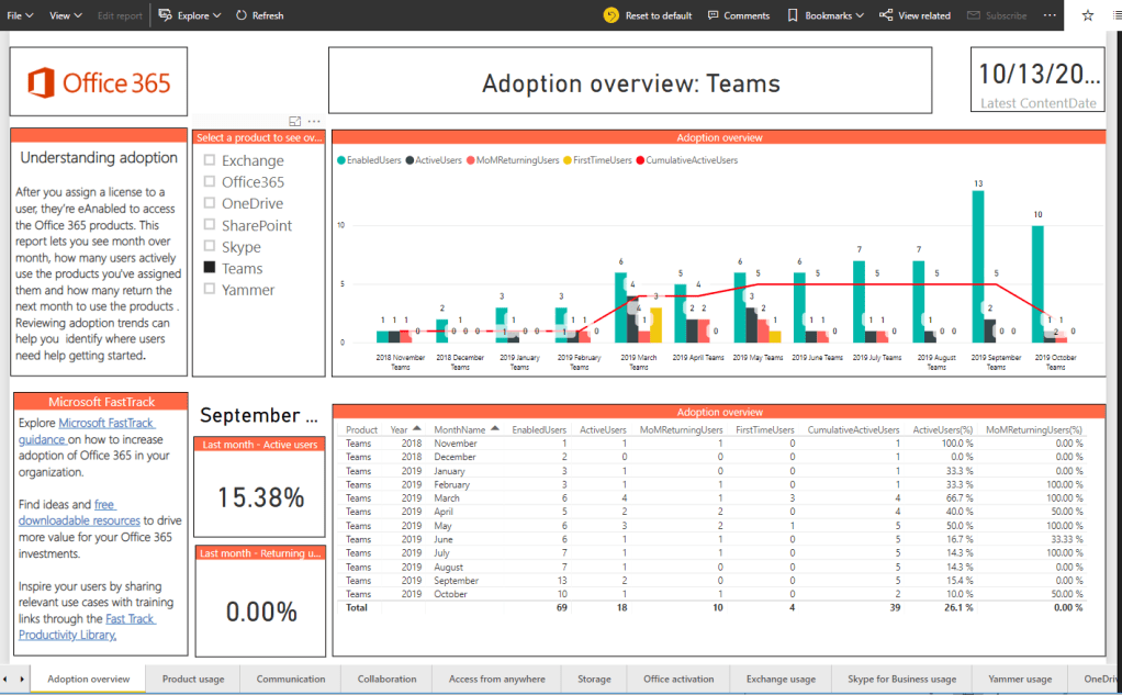 Once done we see the visibility on utilization of all the services. Example we have the adoption overview on the Teams.