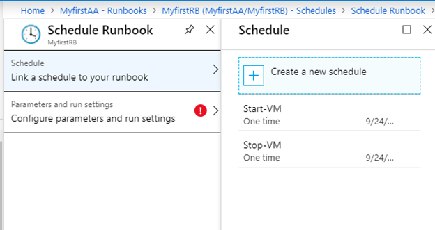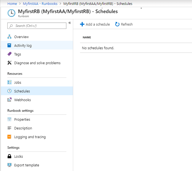 Now we will attach these schedules with the runbook. Go to Runbook and then open the runbook, click schedules and then + Add a schedule