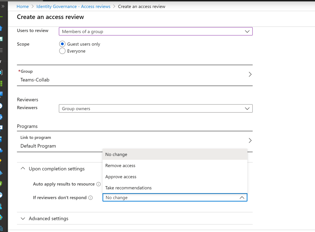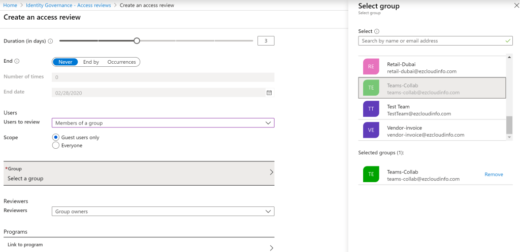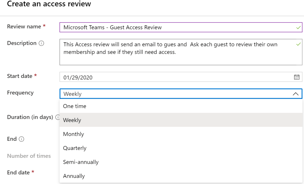 Now we can create them with name ,description , start date and frequency of how often the access reviews needs to take place for the office365 groups.