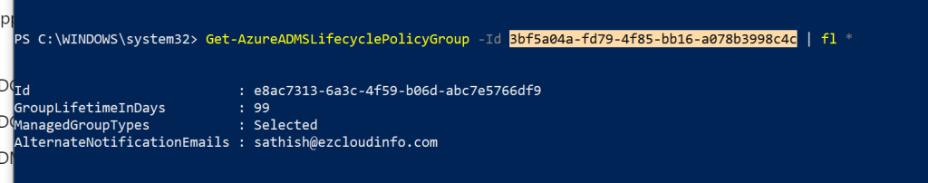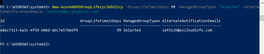New-AzureADMSGroupLifecyclePolicy -GroupLifetimeInDays 99 -ManagedGroupTypes "groupid" -AlternateNotificationEmails "sathish@ezcloudinfo.com"