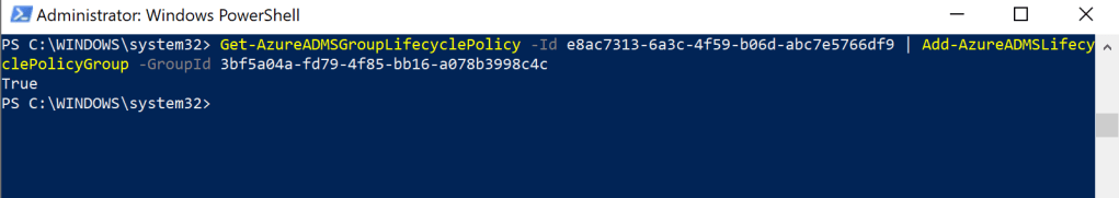 Get-AzureADMSGroupLifecyclePolicy -Id "admsgroupid" | Add-AzureADMSLifecyclePolicyGroup -GroupId "ID"
