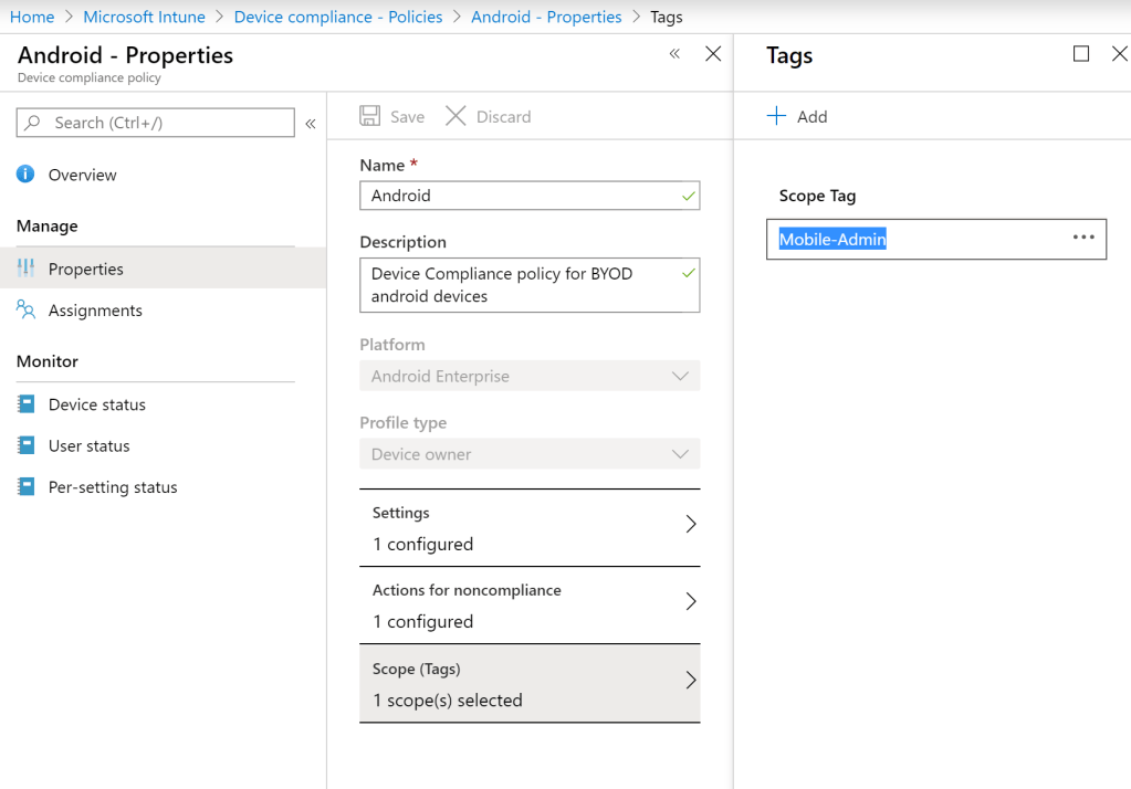 Scope Tag 1: Mobile-Admin – To tag all the BYOD mobile IOS/Andriod policies, users and devices. We have added the created group for intune users. One important point to note here is that all new users who needs to be part of intune policies needs to be added to this group.