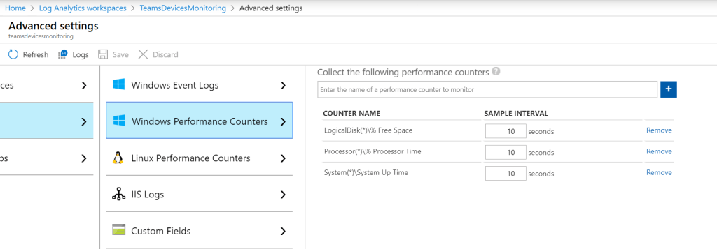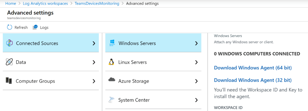 Once the log analytics workspace is being collected we need to configure the data sources so that the log analytics workspace can start collecting the required data for monitoring the Teams Room Systems.