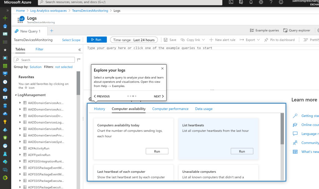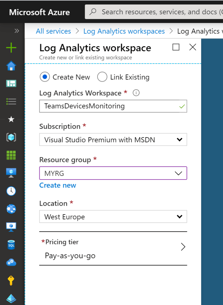 Create new log analytics workspaces. We can use the existing workspace as well and it purely depends on the requirement. Its best recommended to have a separate workspace only for Meeting Rooms.