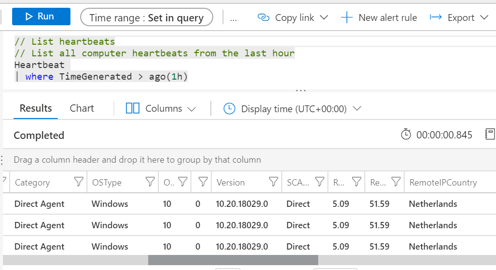 Once we have configured the required log sources it’s the time for us to run some queries and see if the logs are been collected. The azure log analytics workspace works well with Kusto Query Language and SQL Query Language.
