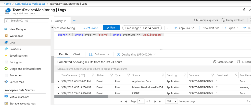 While there are numerous approaches to monitor the Microsoft Teams room systems this article we will go through the steps to monitor them through Azure Log Analytics.Like other applications Microsoft Teams App running on room devices will write all the events on the event logs.Through the Microsoft Monitoring agent in Microsoft Teams it allows these events to be collected in Azure log Analytics.