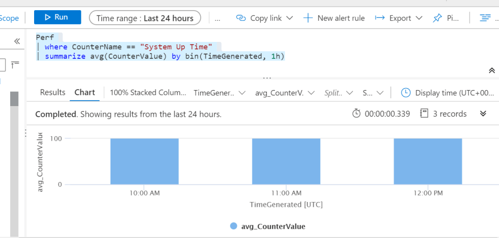 Perf| where CounterName == "System Up Time"|summarize avg(CounterValue) by bin(TimeGenerated, 1h)
