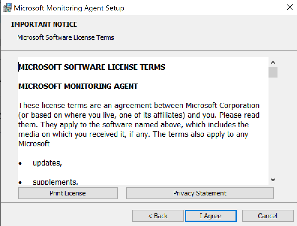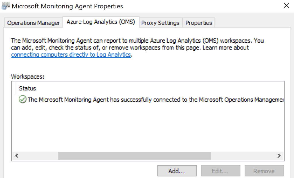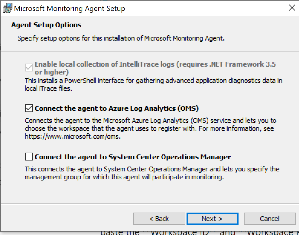Select only the option connect the agent to azure log analytics (OMS) because in our case we are not monitoring them via a local monitoring agent SCOM.