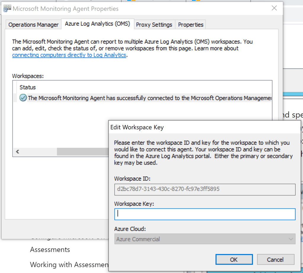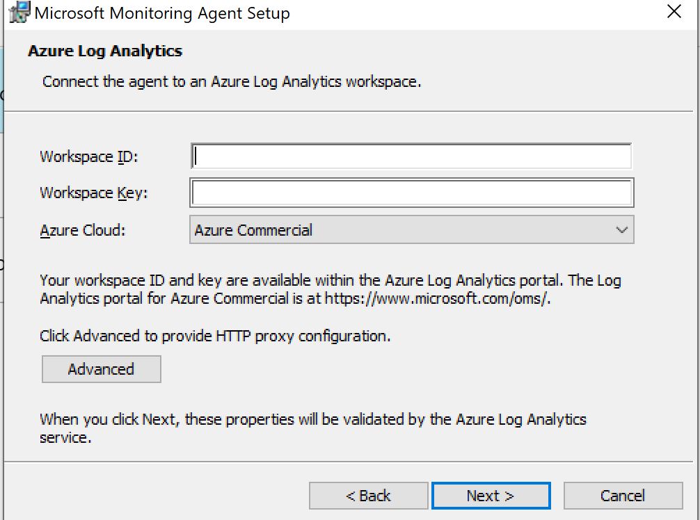 Enter the workspace ID and the key from the log analytics workspace and select Azure Commercial. If the network is going through proxy then click advanced and provide the proxy configuration. If the device is not having connection to the internet then the agent cannot send the logs to log analytics workspace.