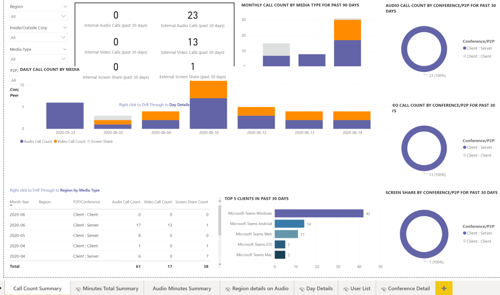 Below example comes from CQD Teams Utilization Report. This gives more info on how the Teams is utilized by users in our organization.Few samples from the templates. The call count summary gives all the information in one view.