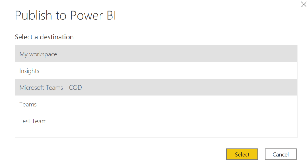 Choose destination the workspace to be published. In our case we have selected Microsoft Teams – CQD and thats the workspace created in PowerBI for Teams CQD.