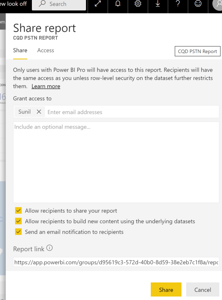 When clicked on share we have the below options while sharing the report. Users will need powerbi pro license and CQD access role to access this report.