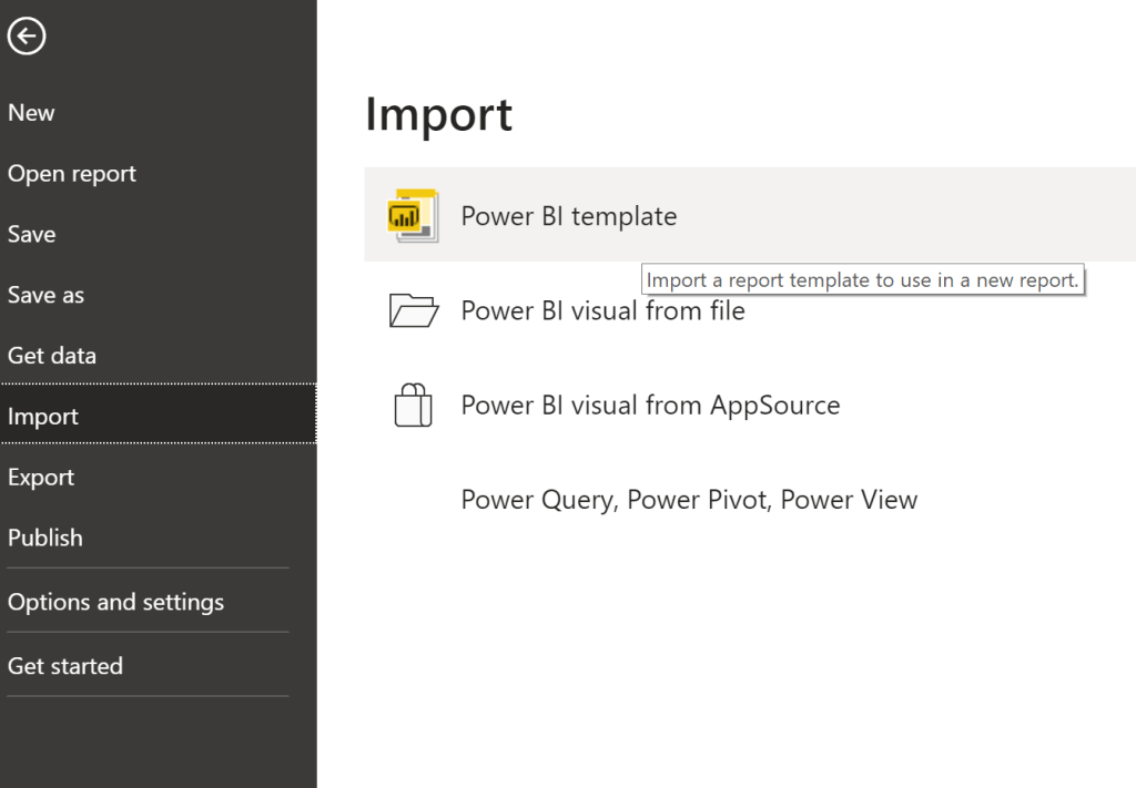 The second option is to import the PowerBI Templates and publish them on the desktop. Inorder to import them navigate to file- import – select power bi template and import all the pbit format files. These templates have to be imported one by one.