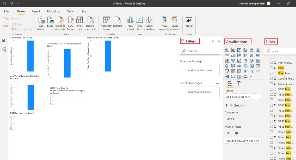 Once connected we will have all the options to build our own custom reports by selecting all the required fields from the right , visualizations and filter. This option is very beneficial where we have our office network details uploaded on the call quality dashboard for detailed analysis and building our own custom dashboards. Here we have selected few fields for example and could see they are populated on the dashboard.