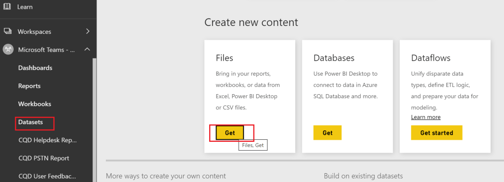 Importing them from the web portal is very much easier. We need to click on the datasets – files and select get option since we need to import the downloaded files here to create the new content.
