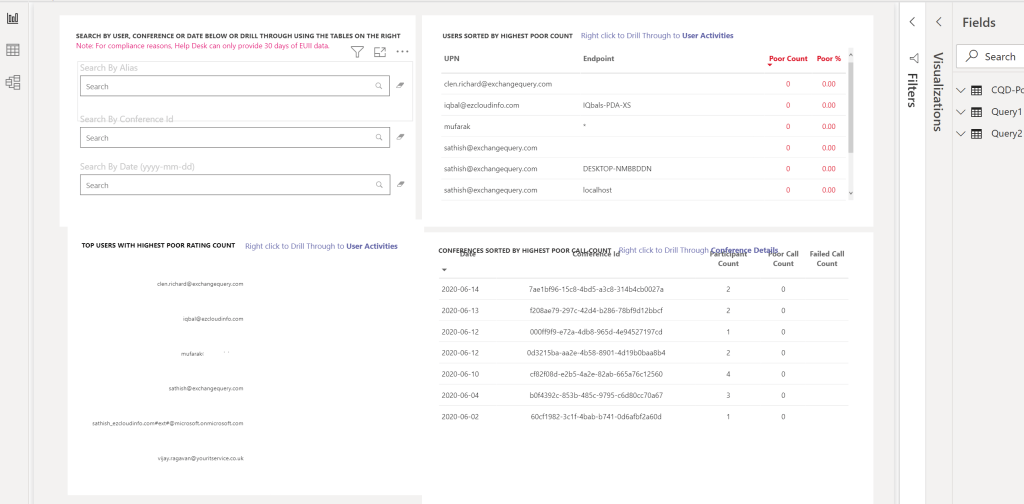 Once uploaded we can see the dashboards. The template dashboards have lot of information especially with user details breakdown which is very nice. The below example is from CQD Helpdesk Report. Here we have an option to search by users, conference or by date which is very convinient.
