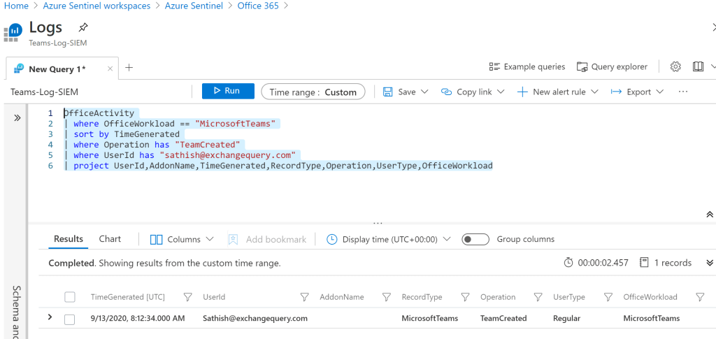 For instance to filter only Team creation can be checked from the workspace. This can be used for filtering even specific person and creating alert for them.