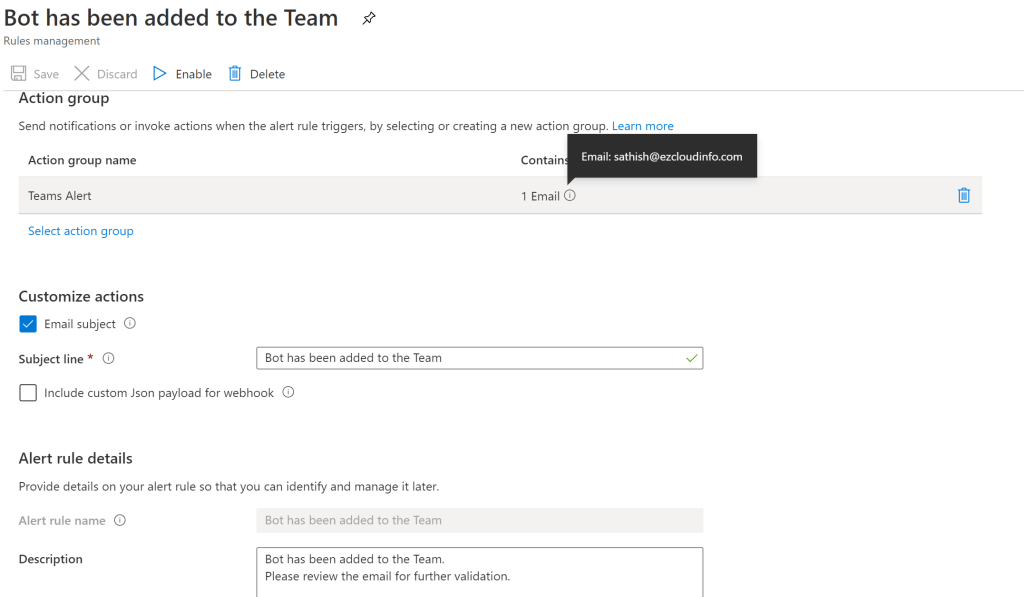 In our case email was selected and after few minutes tested by adding a bot and got the alert notified on email address.