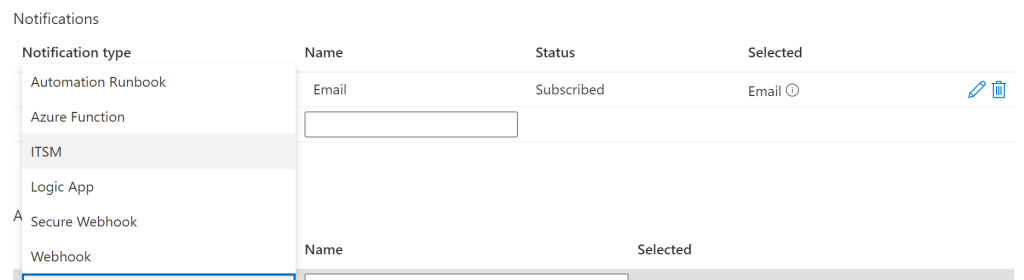 The notification type can be selected for other options like where ITSM can be chosen to trigger an incident for the same events.
