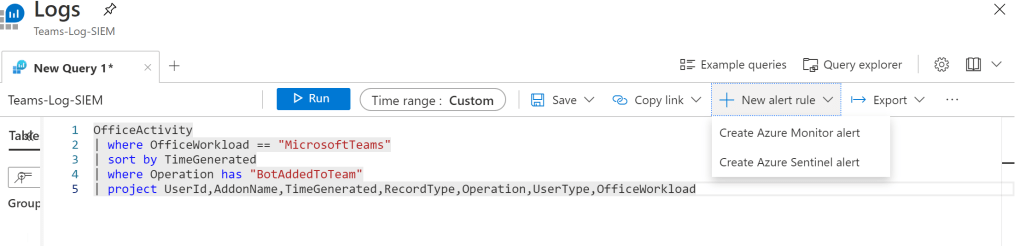To create the alert once after writing the query we have the new alert rule where there is an opportunity to create alerting mechanism in two methods. Create Azure Monitor Alert or Create Azure Sentinel Alert.