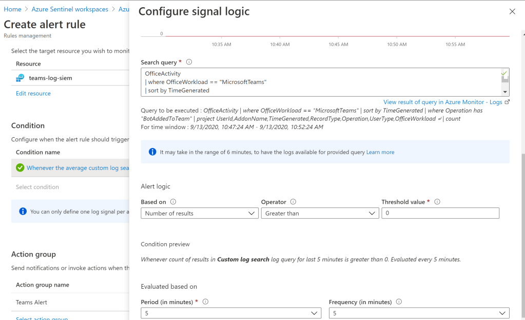 To experience the behavior selected the option Create Azure Monitor alert. Used the same Query. Alert logic and the time period is set for demo and can be defined based on the period and frequency that suits best for the monitoring.