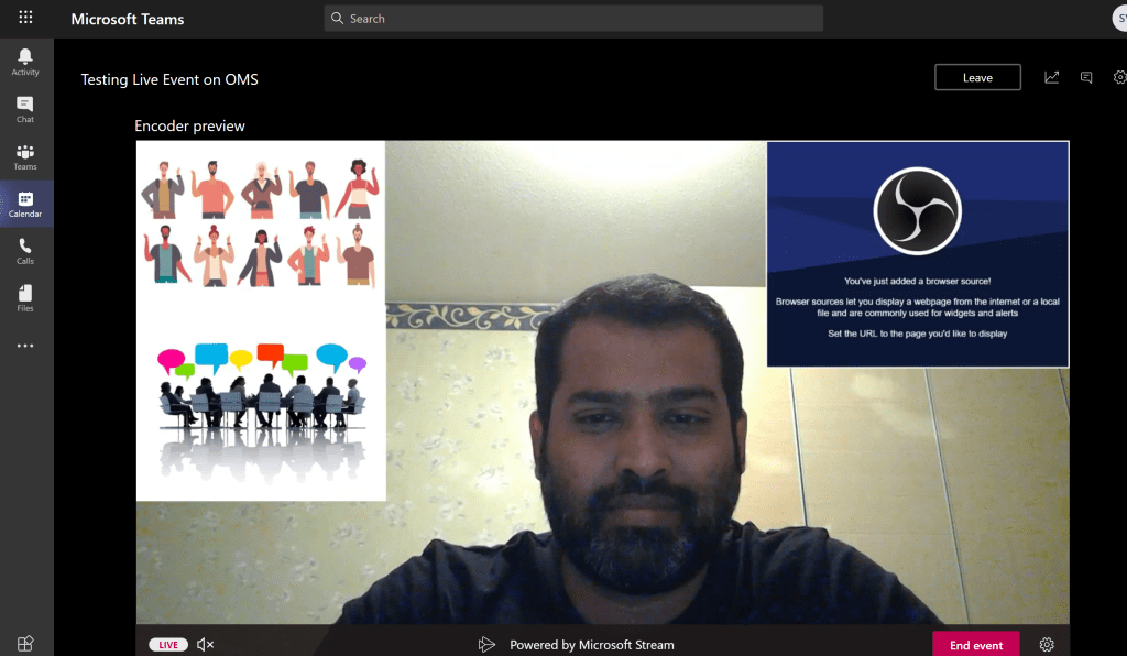 Finally we can see the live events streaming from external encoder app. Below is a sample where we can see the state it says encoder preview and the customized deck with images and browser page.