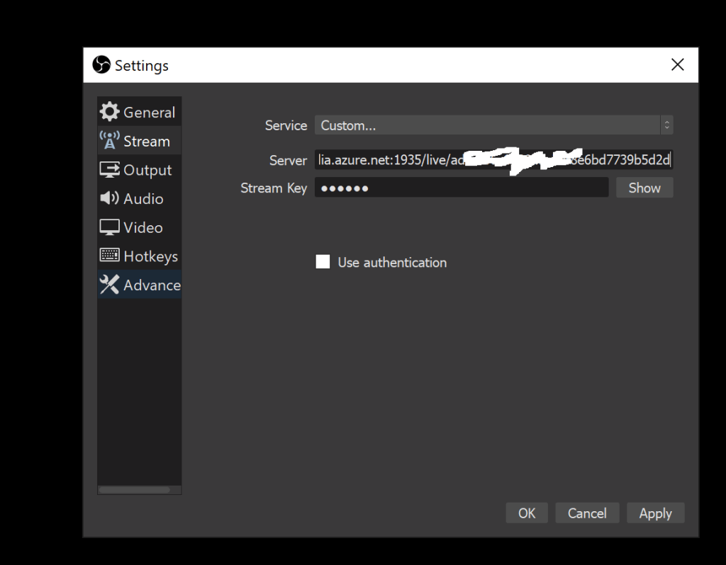 Navigate to stream – in the service select Custom and populate the server URL that was copied from the generated live event. Its mandatory to paste the stream key over here. You can paste some random numbers and that will become your stream key. This part is completed and you can click on apply.