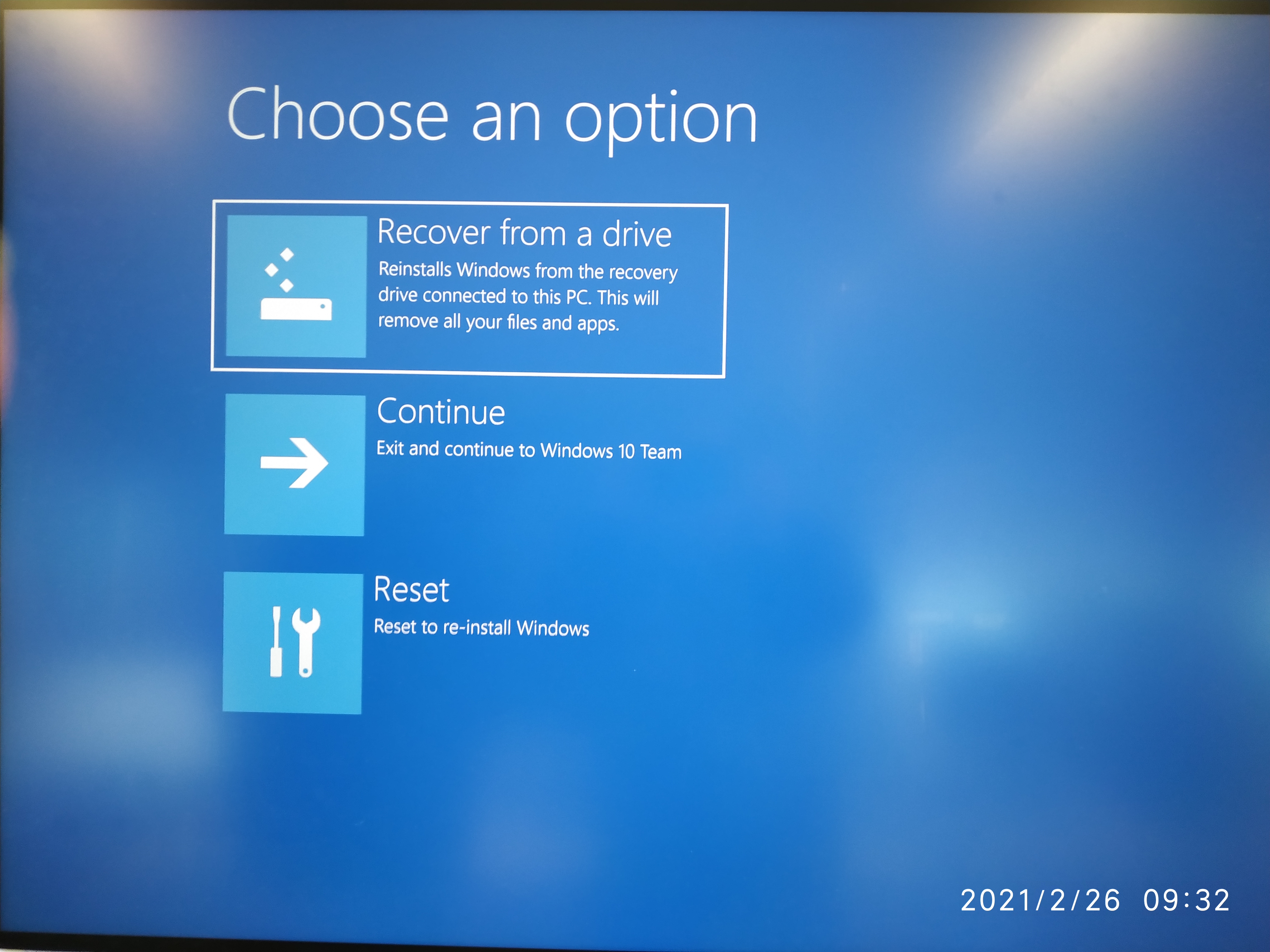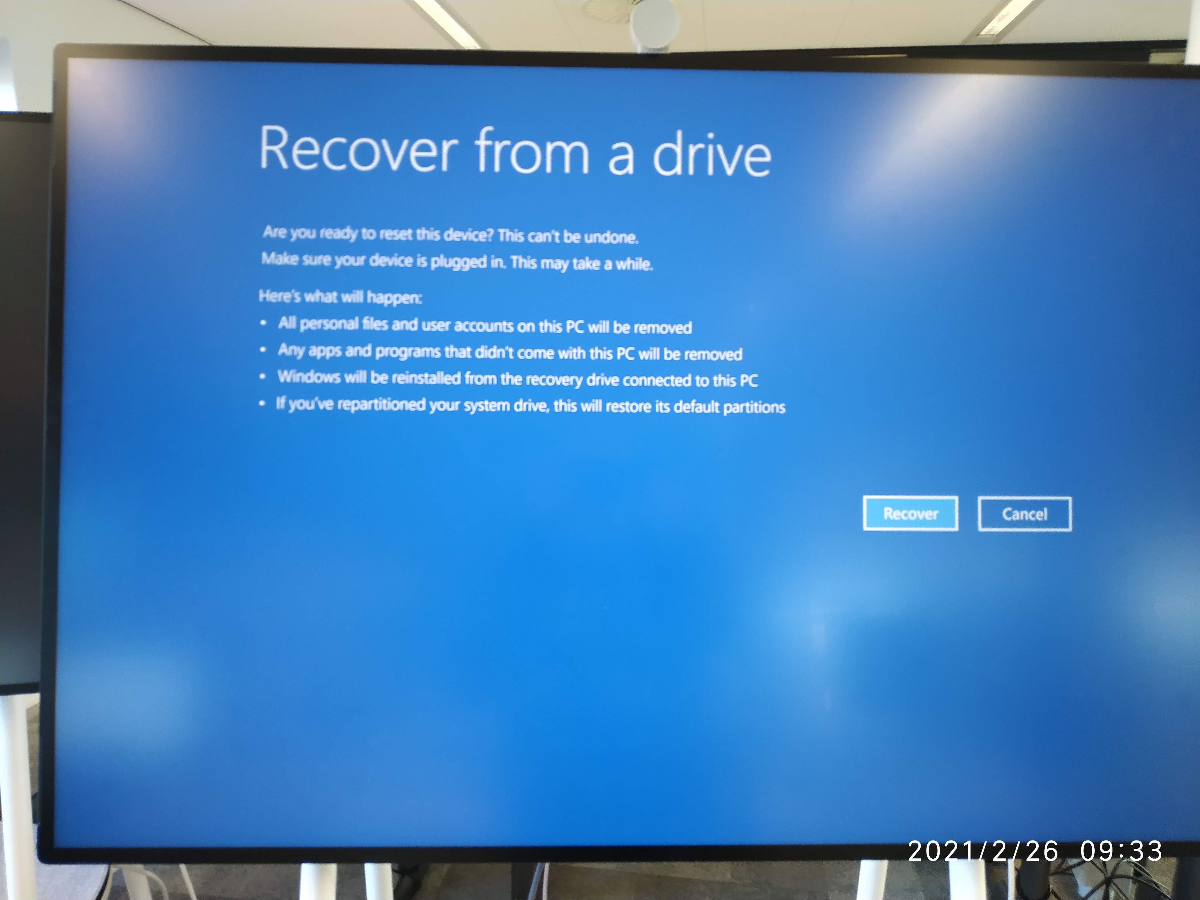 The Surface Hub will restart 3 times. The first restart will show the progress of the recovery process.