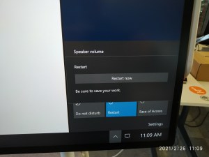 Before we can continue we have to restart the Surface Hub. In the right below corner we now touch the UP arrow. Choose Restart and Restart now to