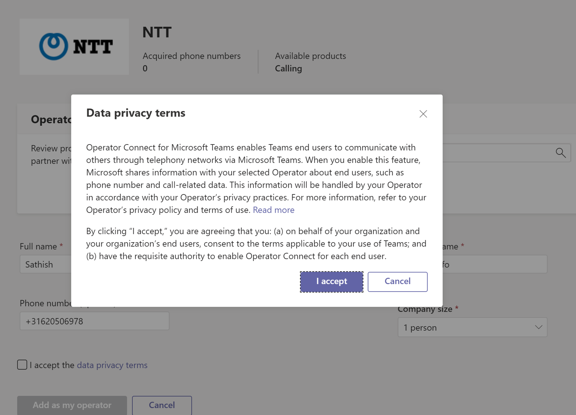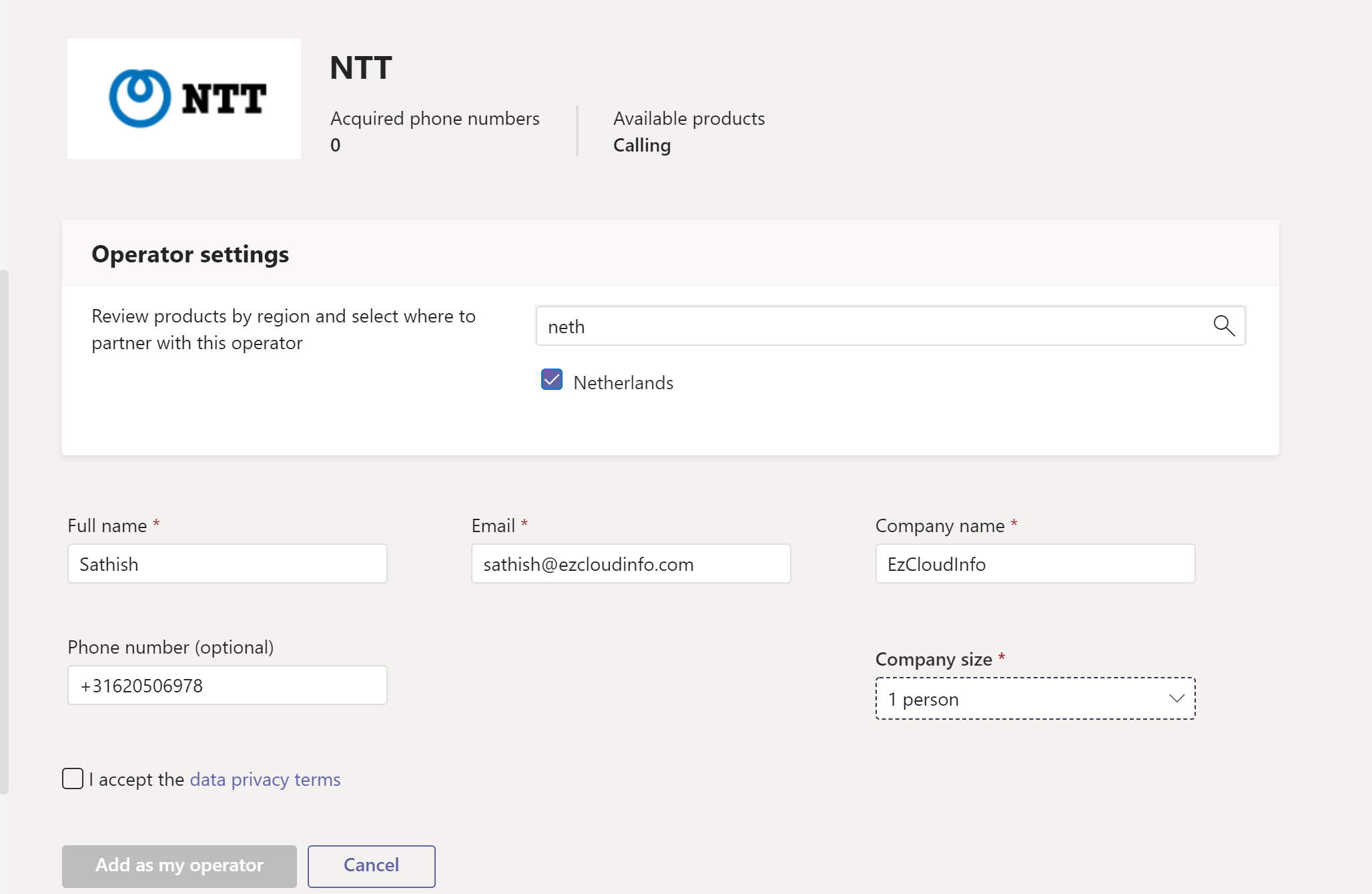 In our example we have chosen NTT and it asks us to enter the below information and accept the data privacy terms.