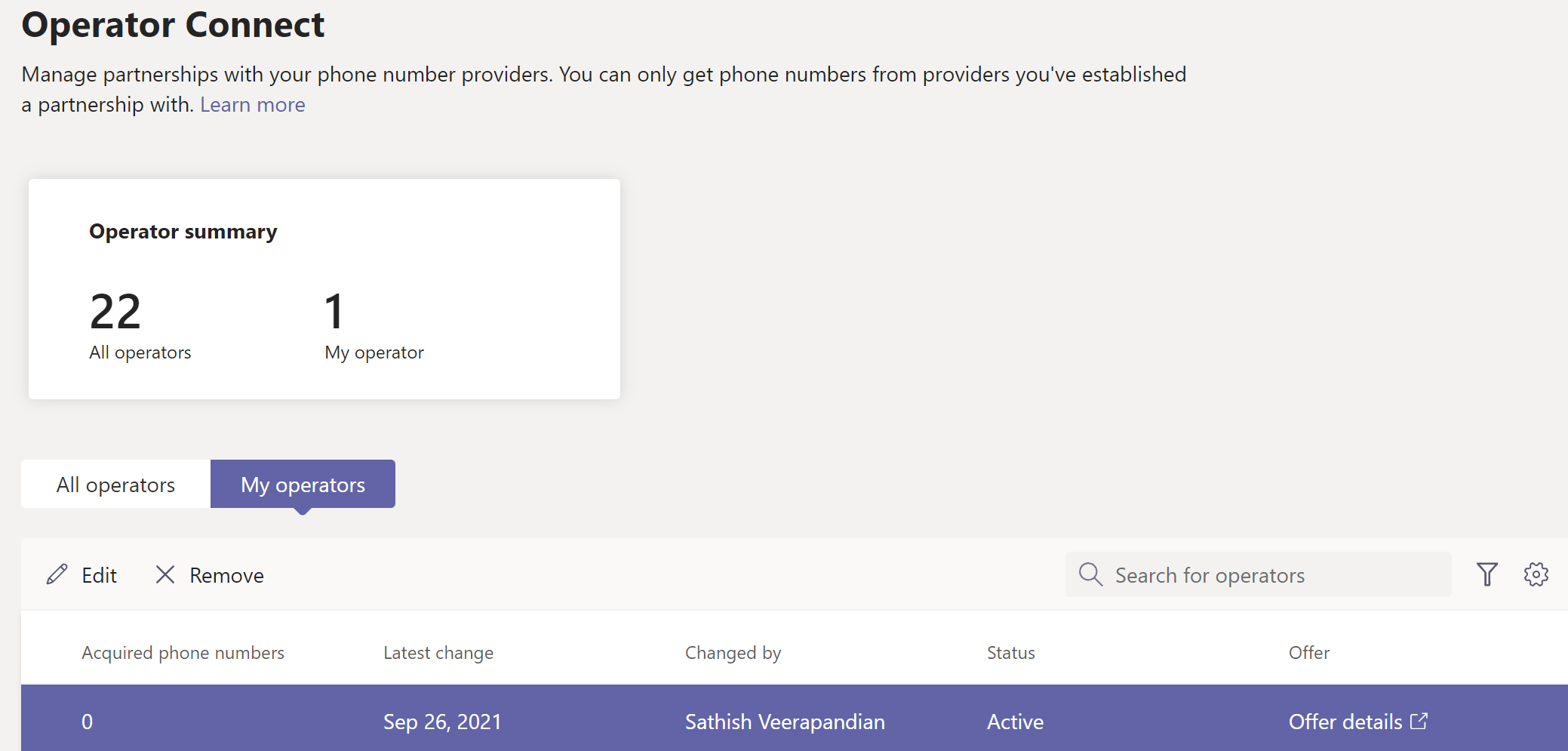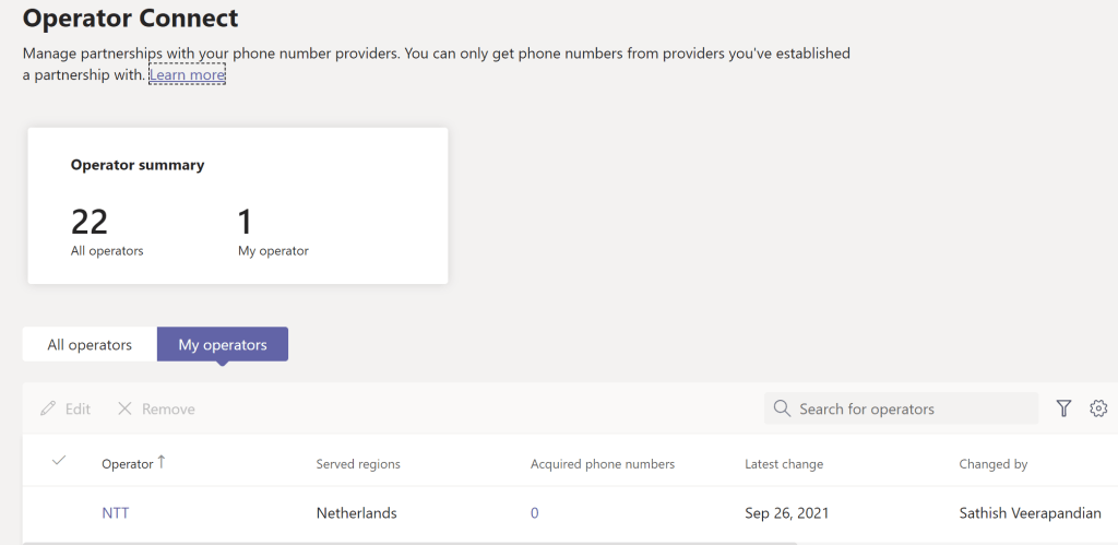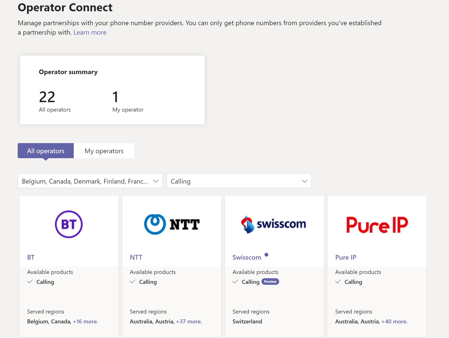 At the moment of writing this post there are 22 operators present in this program which supports upto 60 regions all over the world with Microsoft and the list can definitely grow in future. In this blog we will run through the steps to enable operator connect and the steps to enable them with the provider NTT.