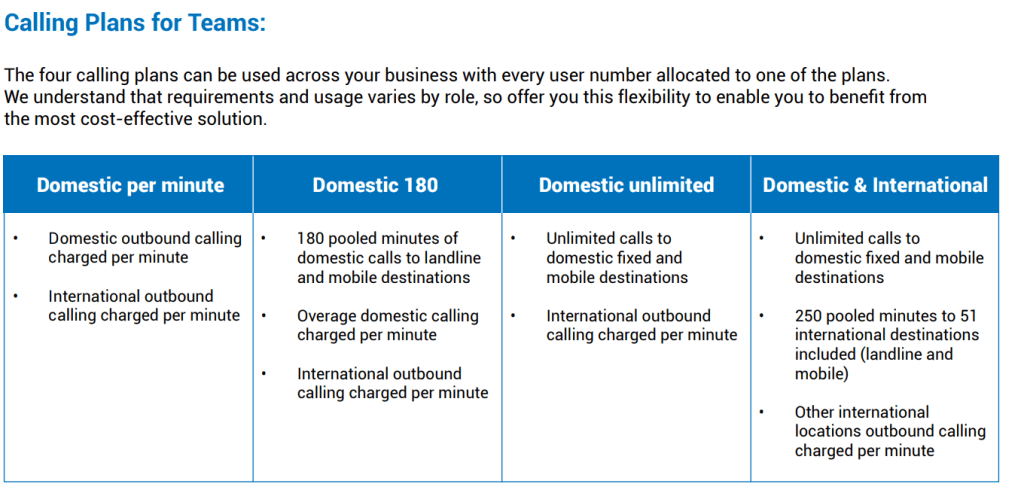 When clicking on calling plans section it takes us to the below screen where they have 4 varieties of option to be chosen by customers based upon users and their business requirements. This is an example for NTT. And for other providers we can see calling plans for Teams based on their offer.