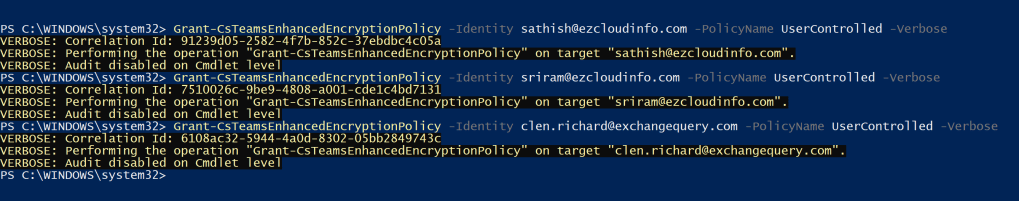 Grant-CsTeamsEnhancedEncryptionPolicy -Identity sathish@ezcloudinfo.com -PolicyName UserControlled