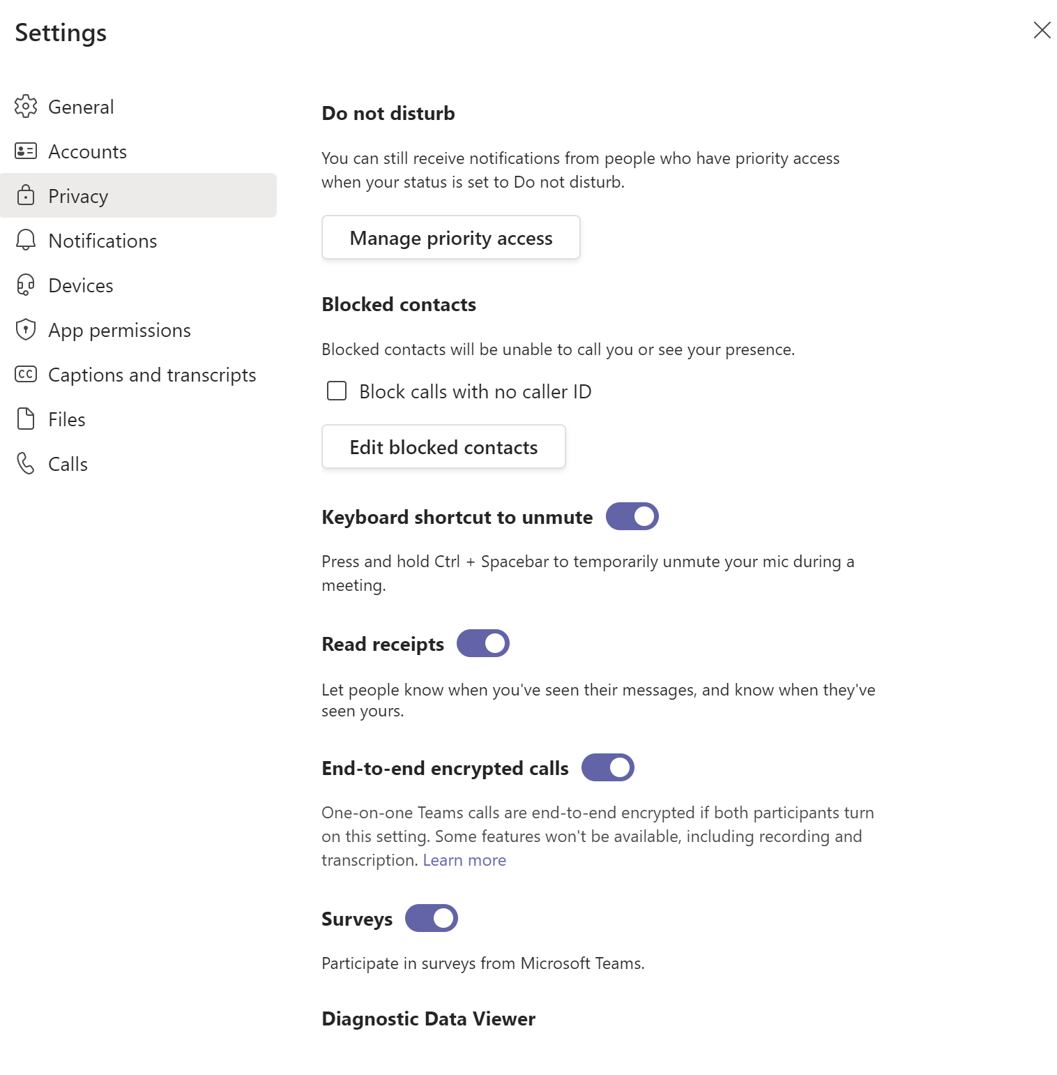 Once after its enabled the policy is not turned on by default to the end users. End users needs to enable them from the Teams Client by navigating to settings – privacy – And after assigning the policy to the user End to End encrypted calls options will be showing and we need to turn them on.