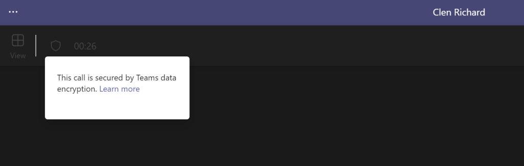 Finally after enabling this policy on both sender and receiver clients after making a test call we can see the information that states the call is being encrypted. In a ongoing call we see the security pad lock and when clicking on them we get the below message which informs us that the call is secured by Teams data encryption.