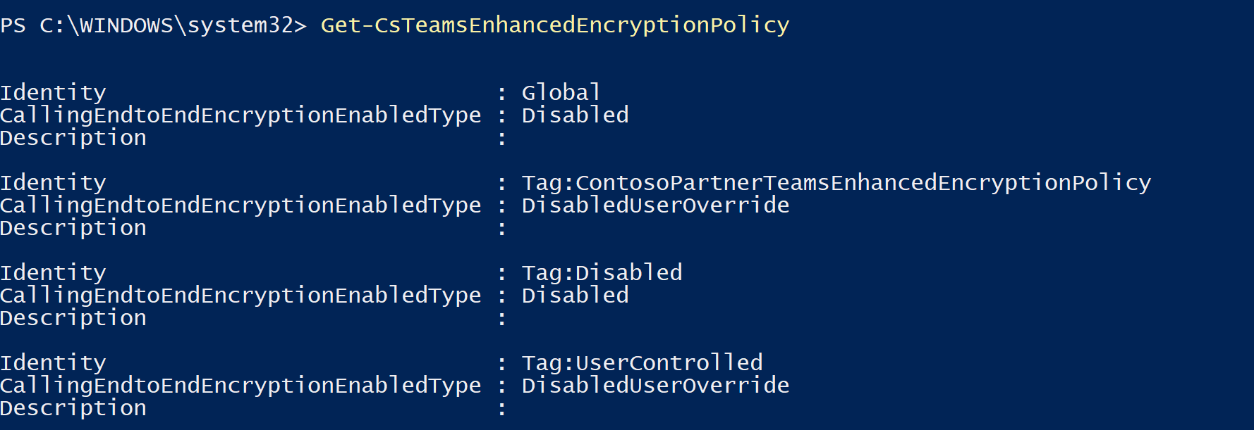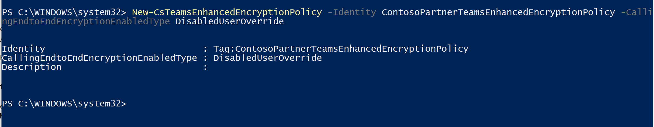 New-CsTeamsEnhancedEncryptionPolicy -Identity ContosoPartnerTeamsEnhancedEncryptionPolicy -CallingEndtoEndEncryptionEnabledType DisabledUserOverride